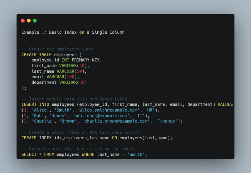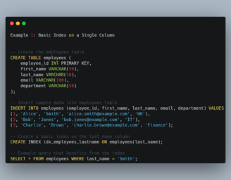 For beginners, starting with a basic single-column index is the simplest way to enhance performance. When you have a table with many rows, an index on a column that is frequently searched (for example, a last name in an employee table) can speed up query execution.