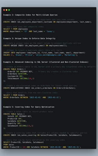 Below are all the complete SQL code examples referenced in this article. You can use these scripts to set up sample tables and indexes in your own environment.
