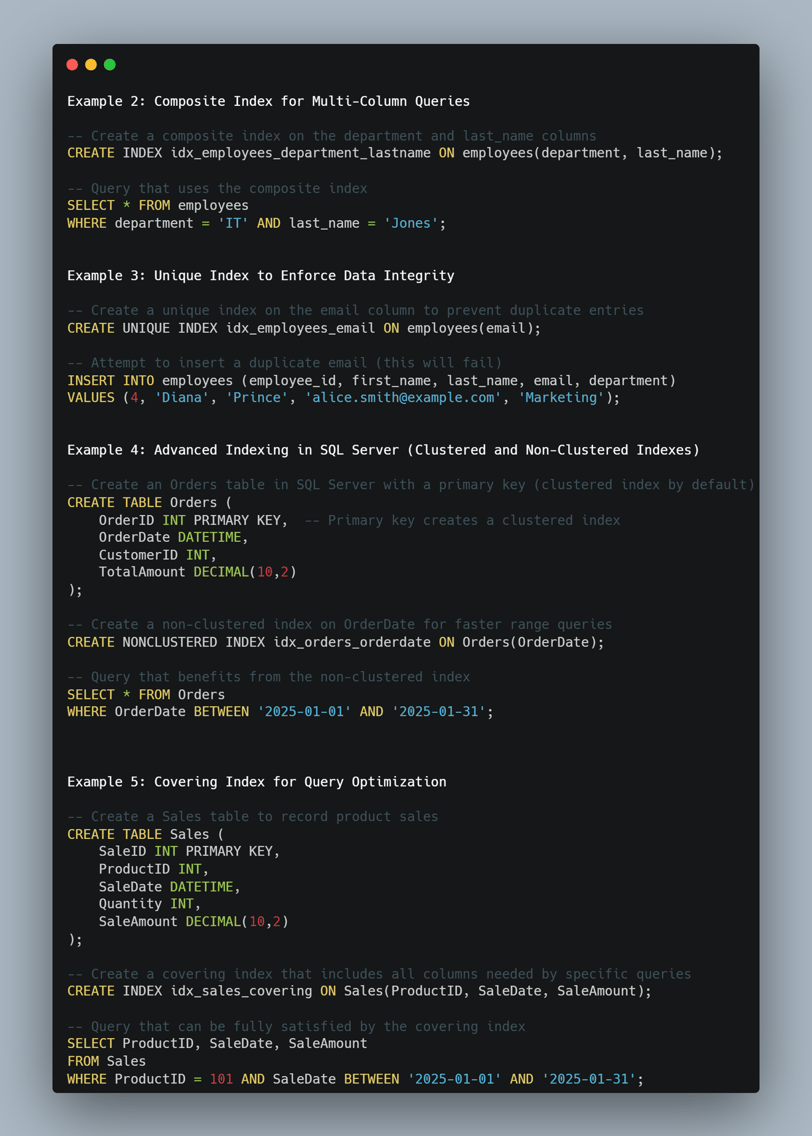 Indexes are essential components in SQL databases that greatly enhance query performance. They act as roadmaps that allow the database engine to quickly locate the data you need without scanning the entire table. In this expanded guide, we’ll explore indexes in depth—from the basics to more advanced techniques—and then provide all the complete SQL code examples in a dedicated section at the end.