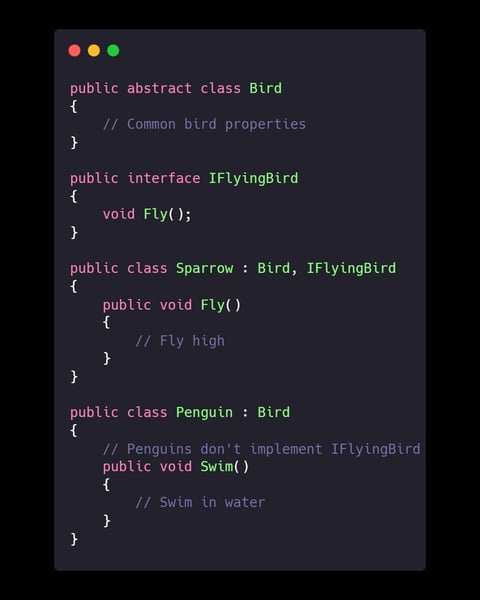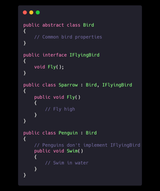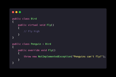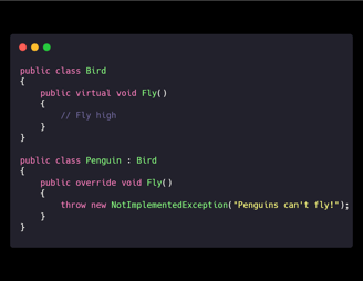 Explanation: By not forcing all birds to implement Fly, we prevent unexpected errors when substituting subclasses.