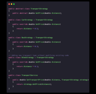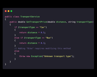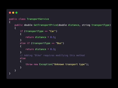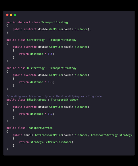 Explanation: New transport types can be added without altering the original TransportService class, preventing accidental bugs.