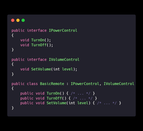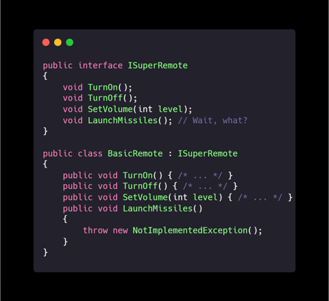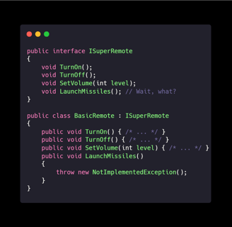 Explanation: By splitting interfaces, classes only implement what they need—no mysterious missile buttons!