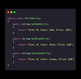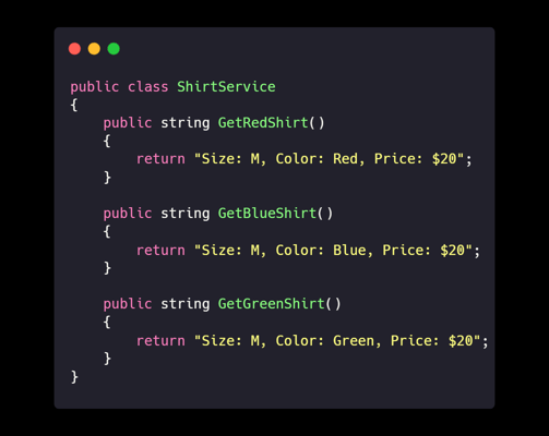 Explanation: By creating a generic GetShirt method, we avoid repeating code and make it easier to manage changes (like updating the price).