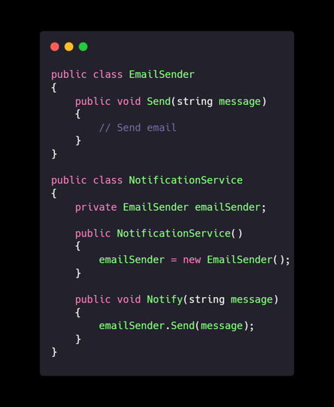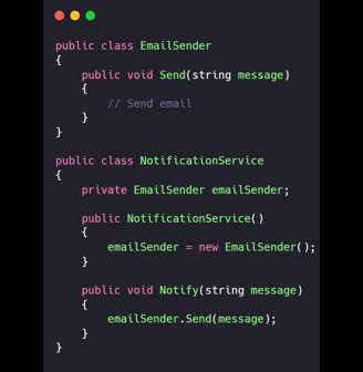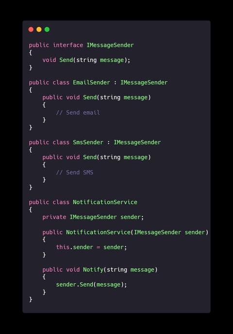 Explanation: The NotificationService depends on an abstraction (IMessageSender), allowing it to use any kind of sender—email, SMS, owl post, you name it.