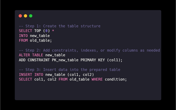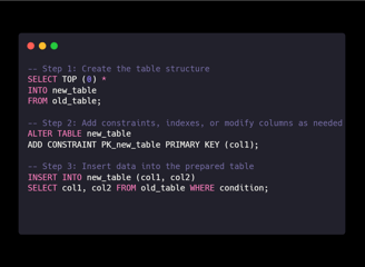 Real-world example: Imagine a colleague running SELECT INTO to generate a table for reporting, only to find out later that the column types defaulted to something unexpected (e.g., nvarchar when they needed varchar). Debugging that is a nightmare.